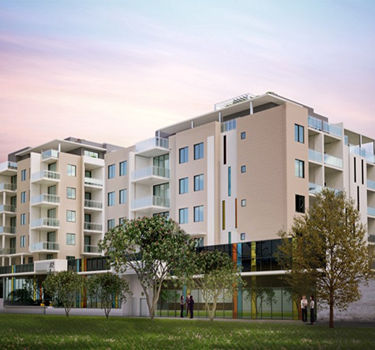 A multi-story, mixed-use commercial and residential development, including basement parking.